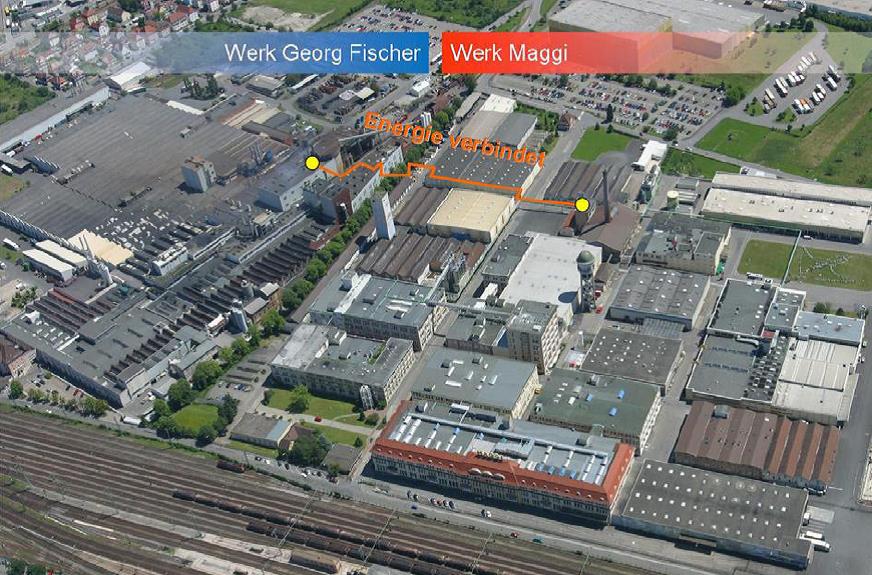 Die Abwärme des Kupolofens der Firma Georg Fischer Automobilguss GmbH konnte nur bis zu einem Drittel intern verwendet werden. Durch die Auskopplung der Abwärme zur Dampferzeugung im benachbarten Maggi-Werk des Nahrungsmittelherstellers Nestlé Deutschland AG kann die Abwärme ganzjährig und vollständig genutzt werden.Technische Beschreibung